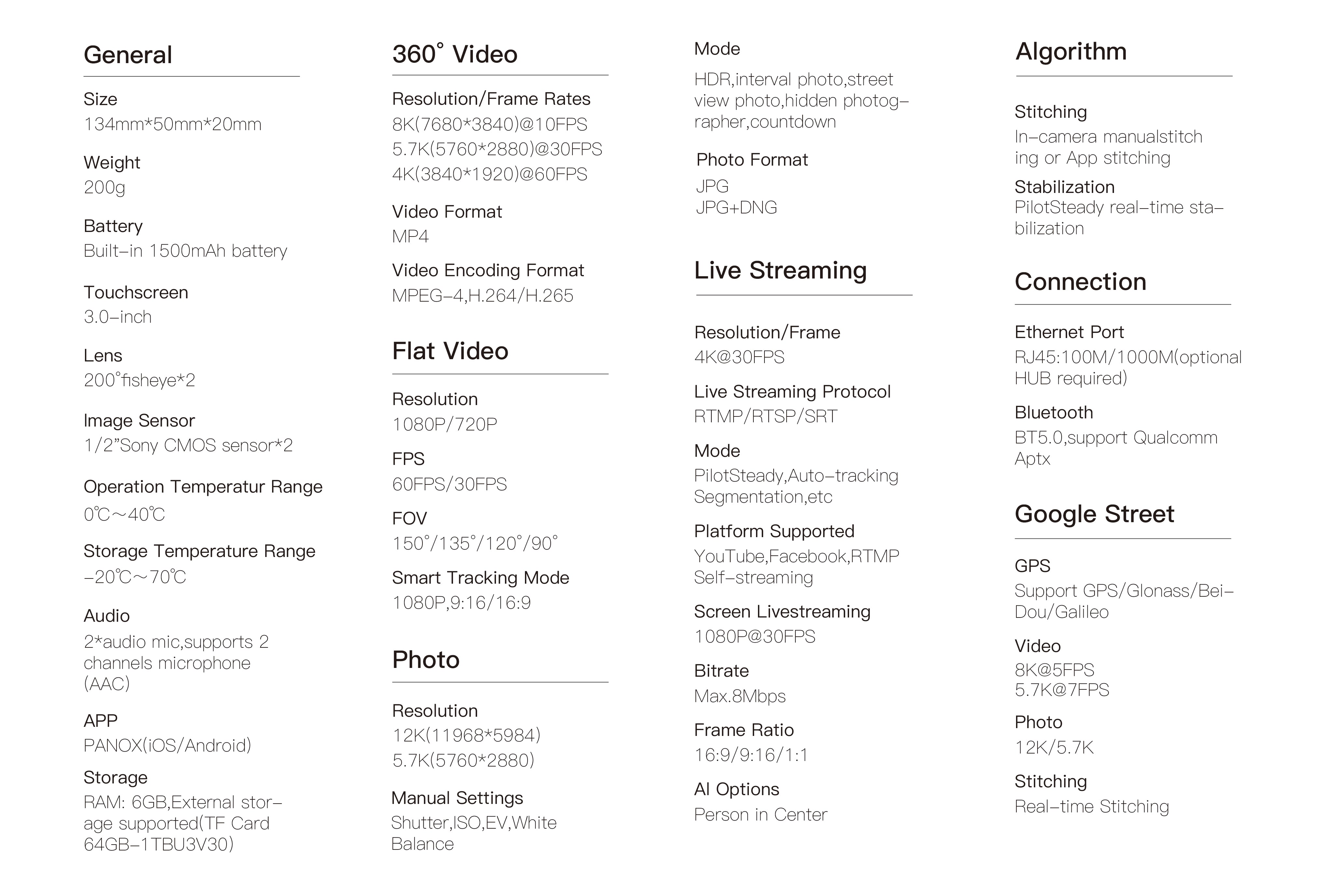 高质量全景成像;多种宽高比和平台支持;实时全景直播;用户友好的界面设计;内置高精度GPS模块,支持全球主要的卫星导航系统,高效的街景拍摄;支持蓝牙连接外部麦克风。